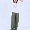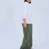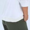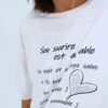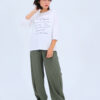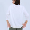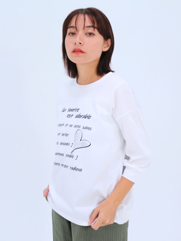 6分袖ゆったりシルエット。前身頃にはロゴデザインプリントを施したPOP系デザインTシャツ。デイリーに着まわせるタイプ。