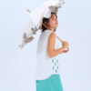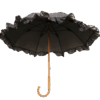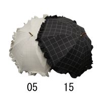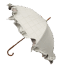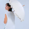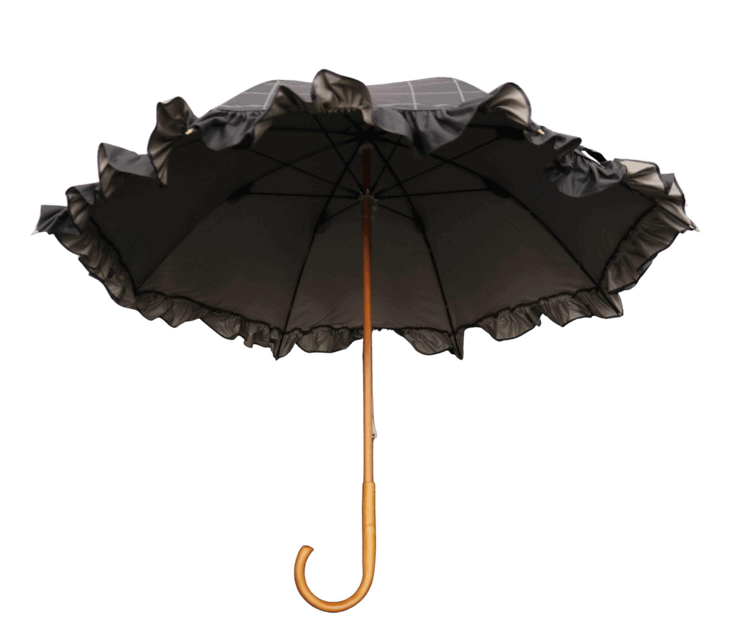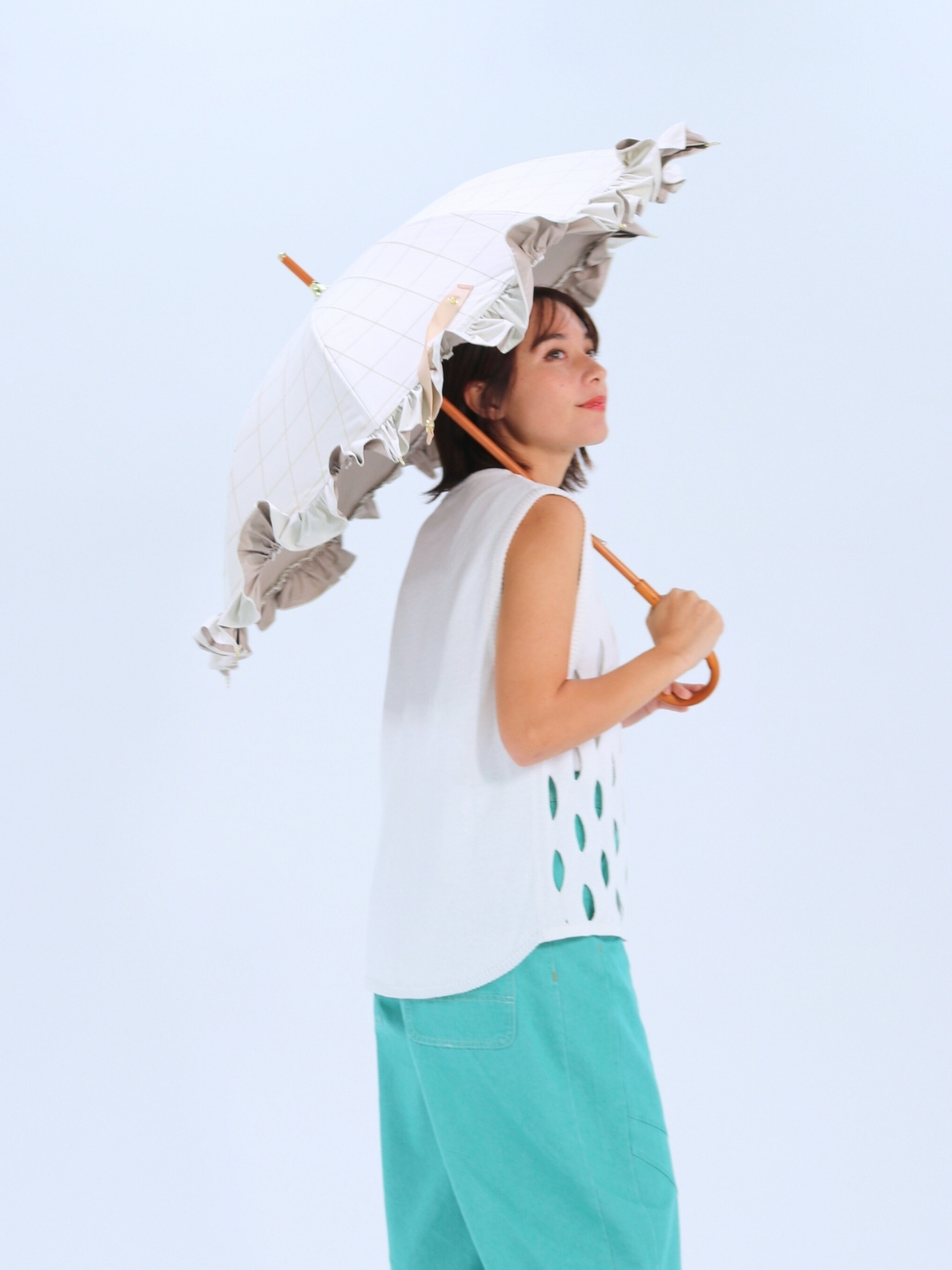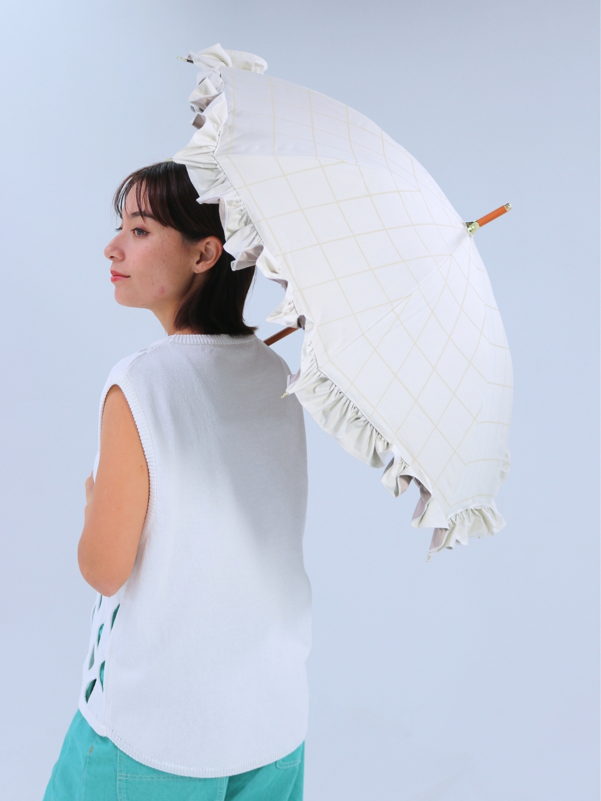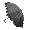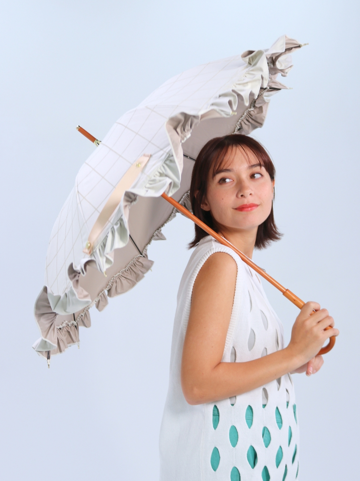 木の持ち手と、シンプルチェック&フリルが高級感のある日傘。 素材も涼し気で持つのが楽しみになるアイテム。