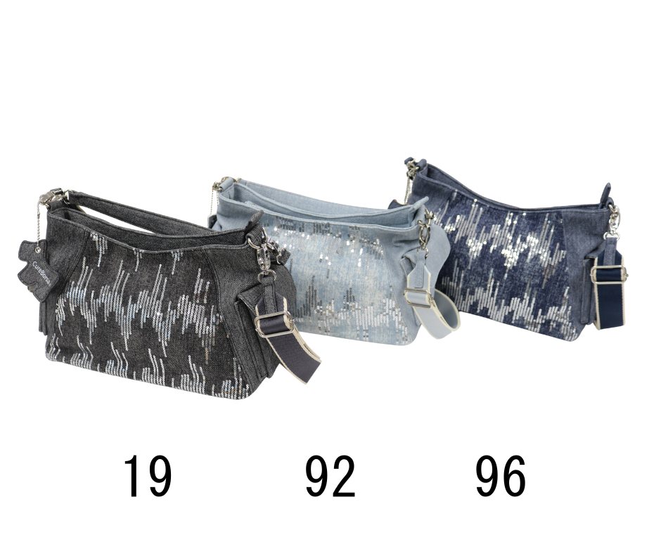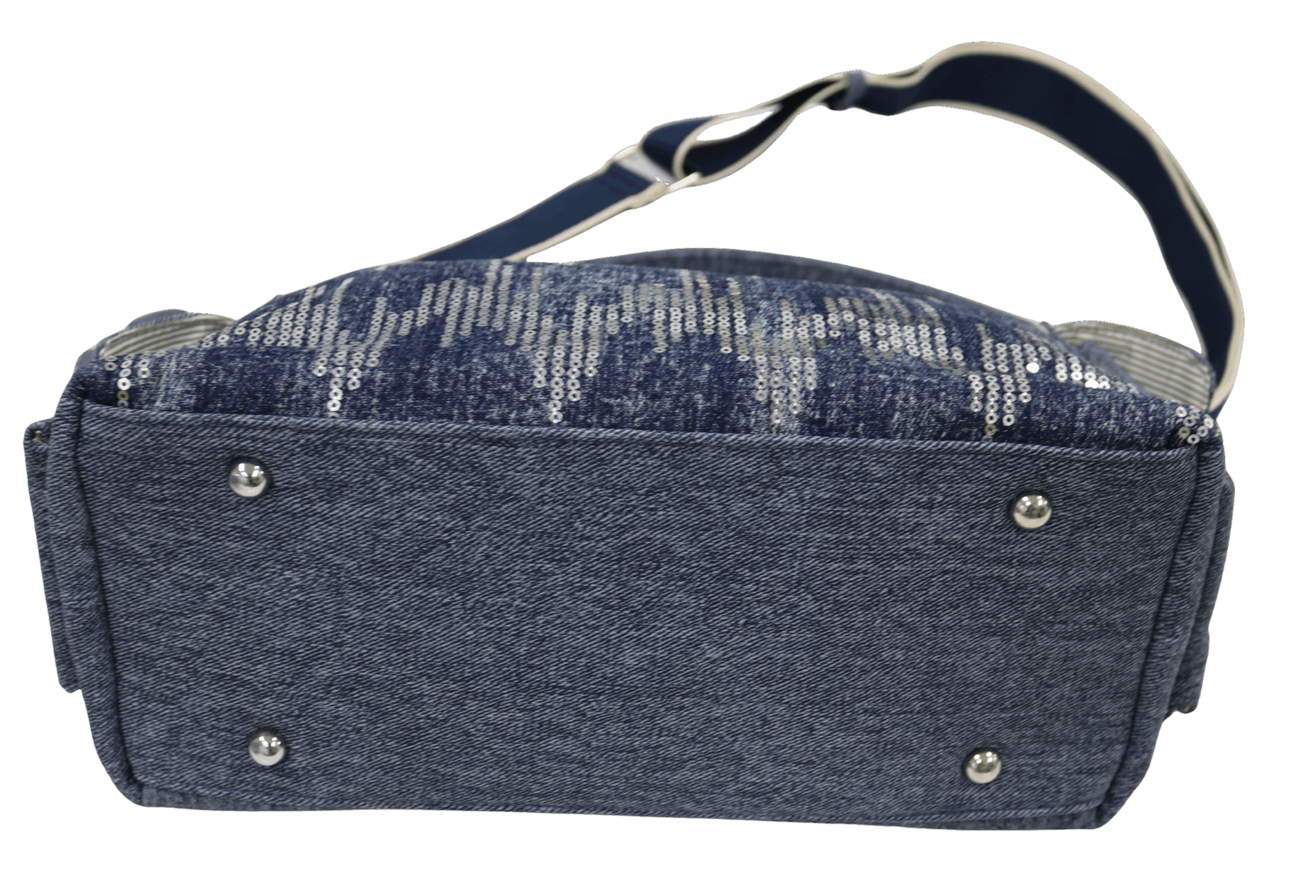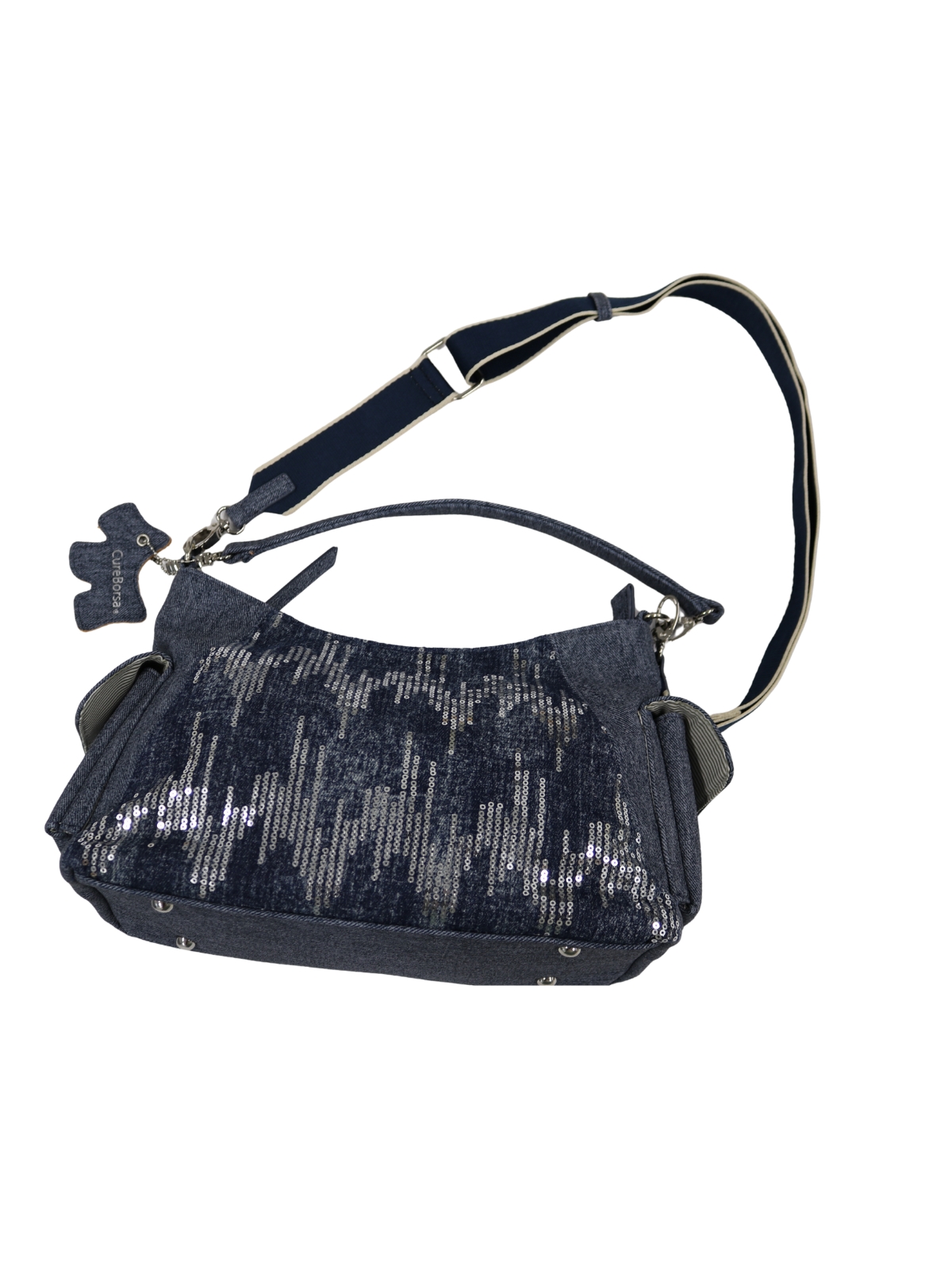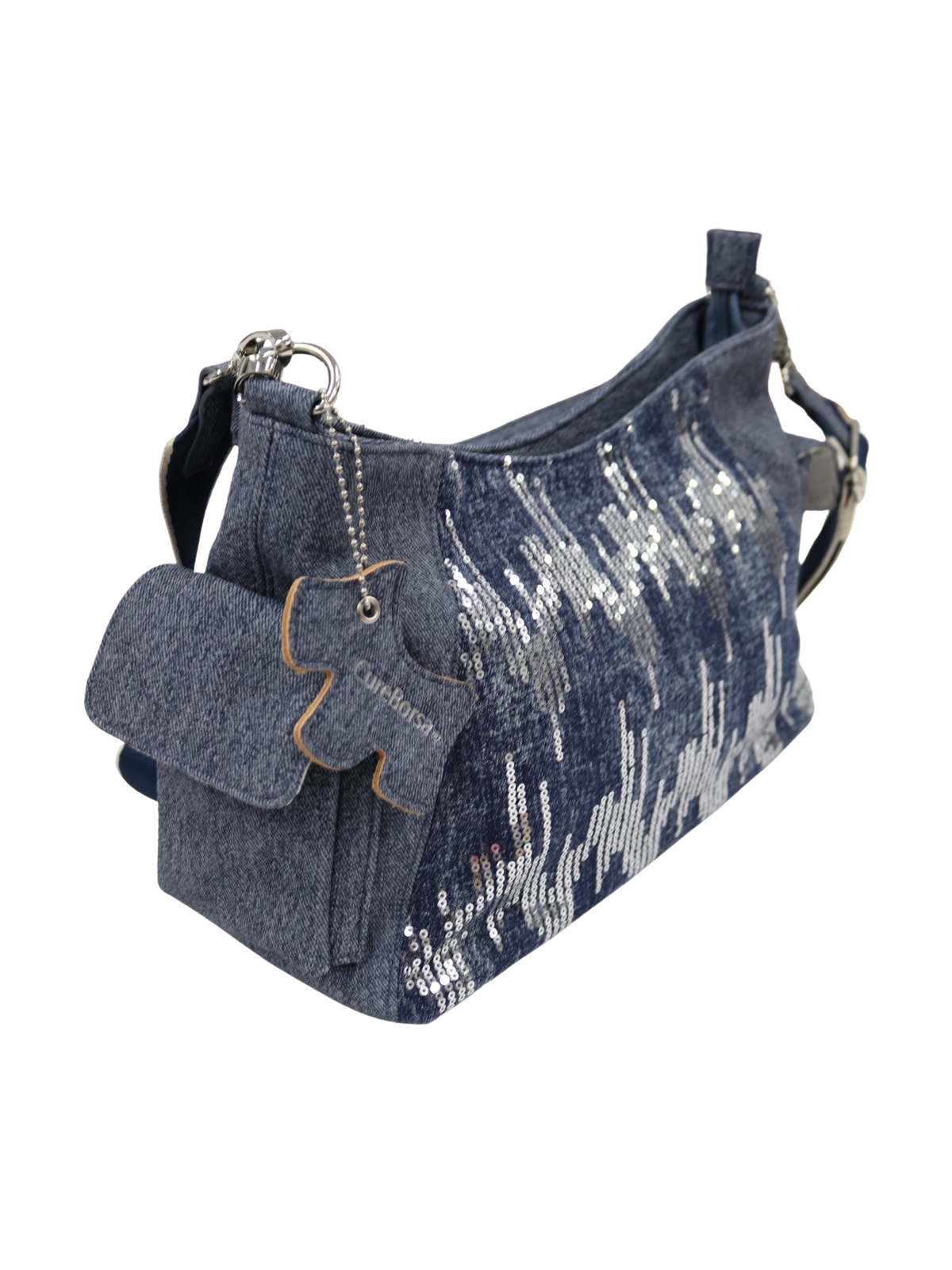 デニム調素材にスパンコールでエレガントさをプラスしたバッグ。 ショルダー付で2WAY楽しめます。