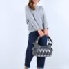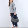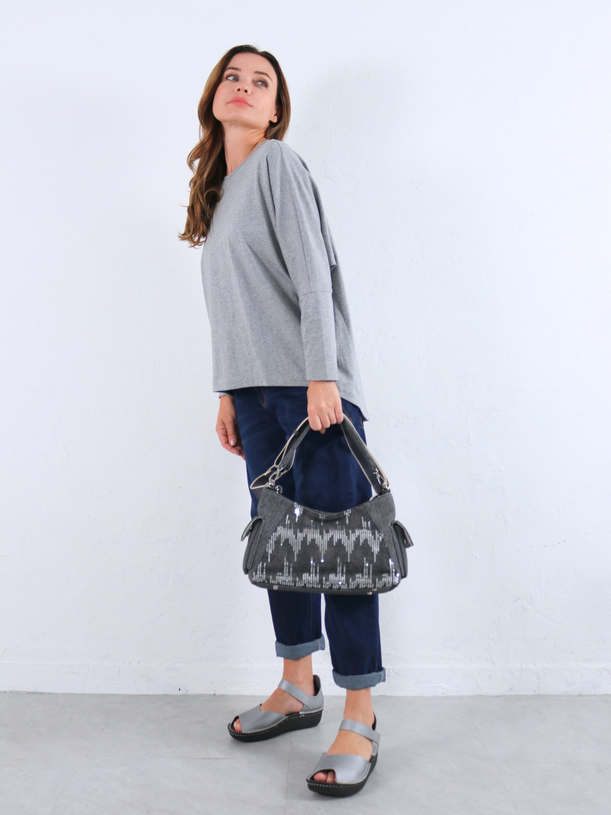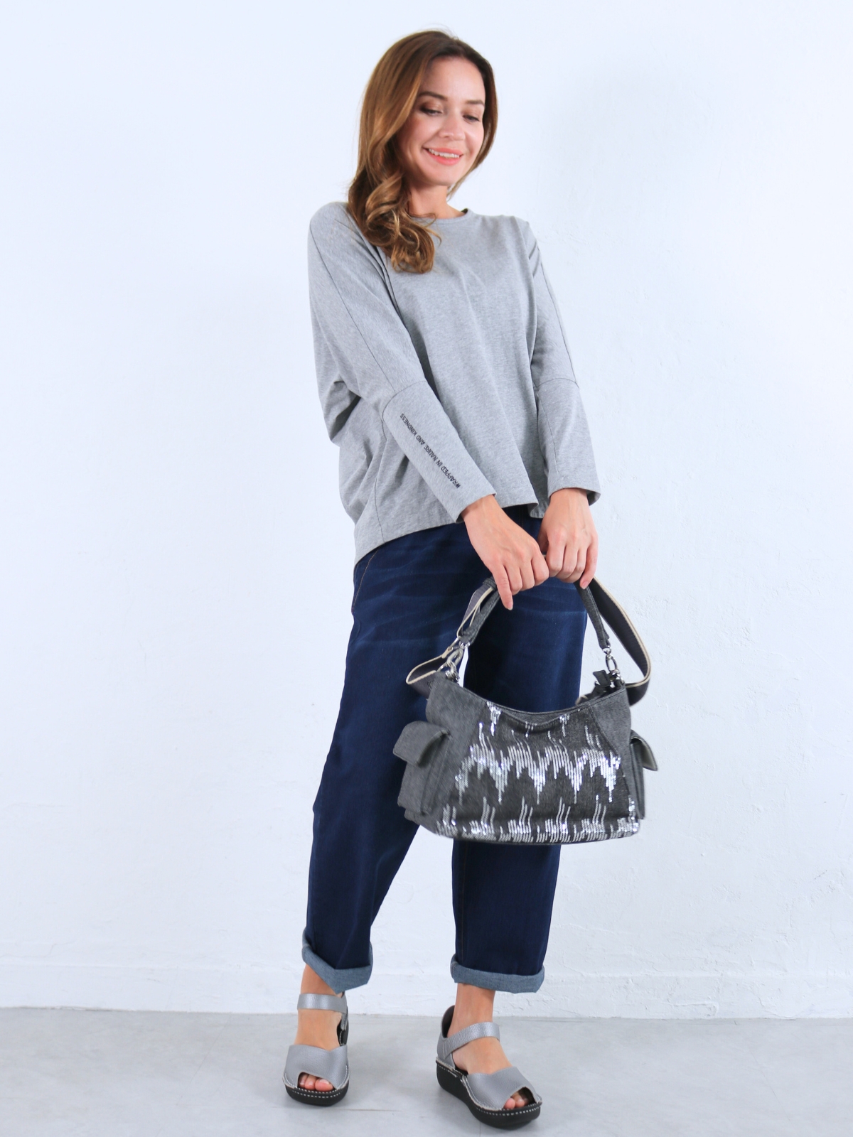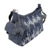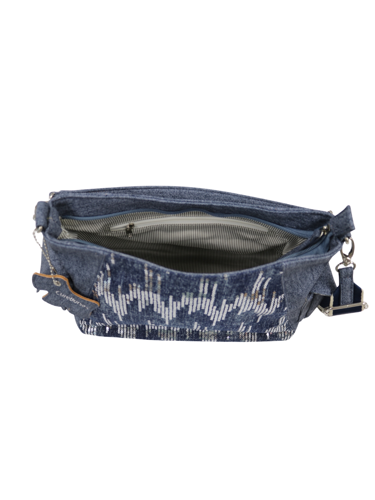 デニム調素材にスパンコールでエレガントさをプラスしたバッグ。 ショルダー付で2WAY楽しめます。
