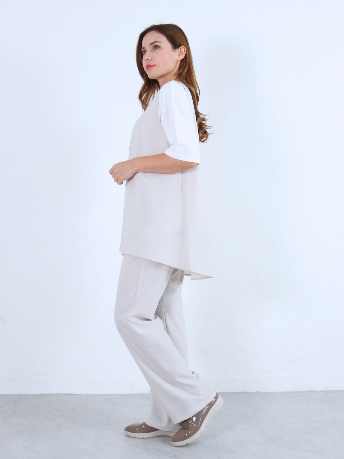 同素材のパンツとSET-UPでマニッシュなSTYLEに。