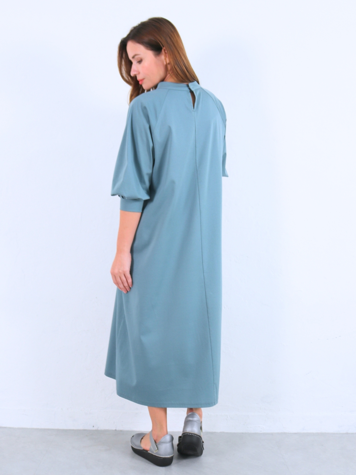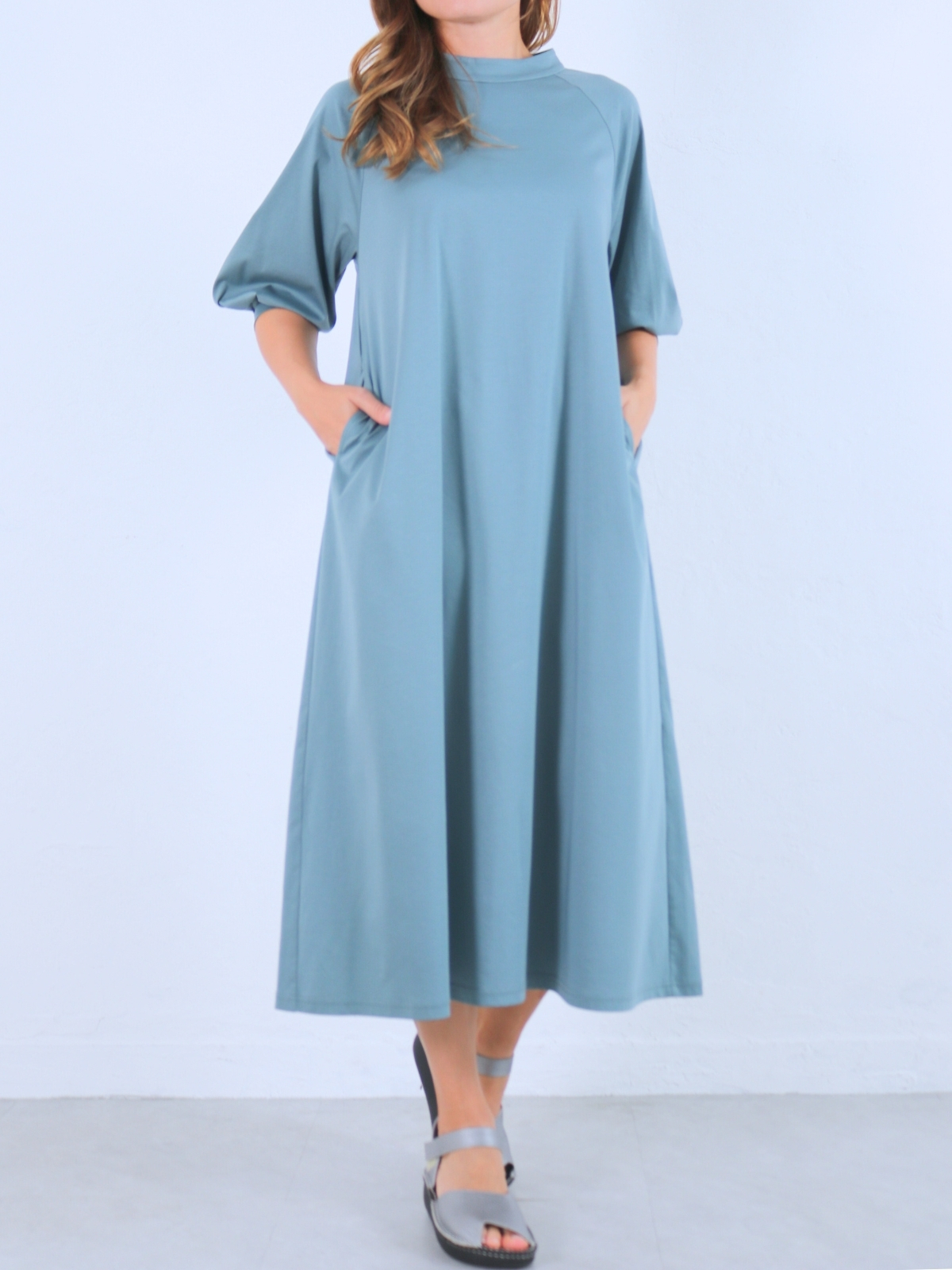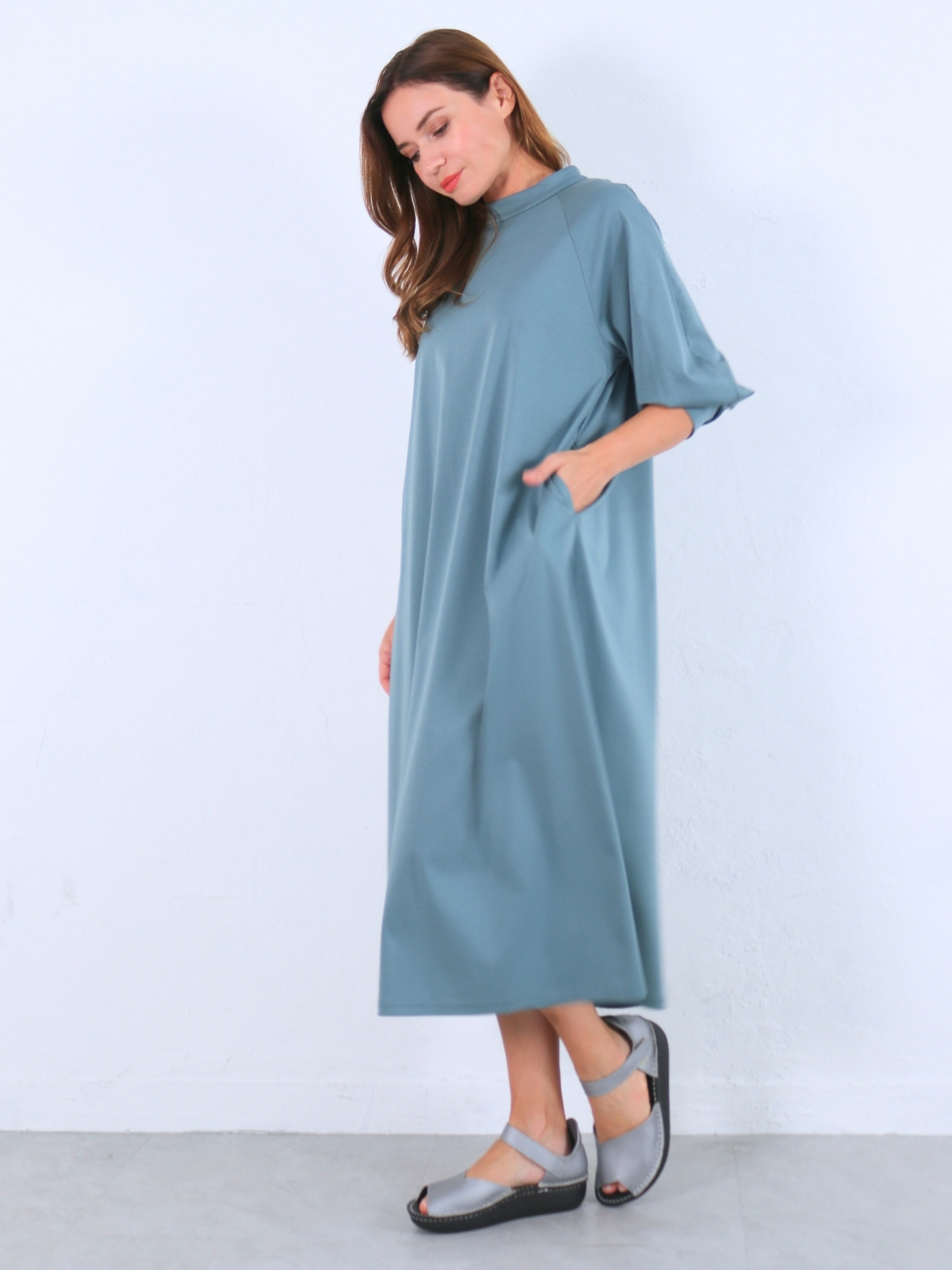 ソフトでライトなコットンスムースジャージ素材のチムニーネック・袖コンシャスワンピース。 1枚で”サマ”になる!気軽でラクチン・Aラインワンピース。
