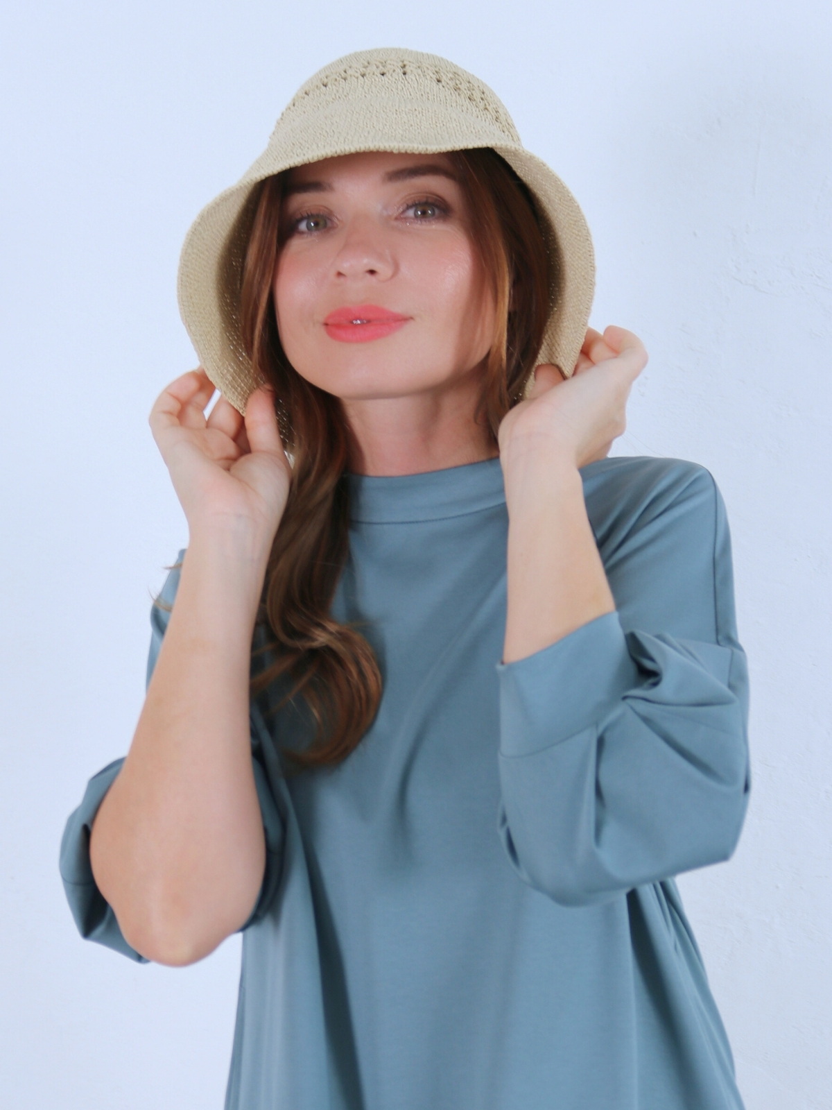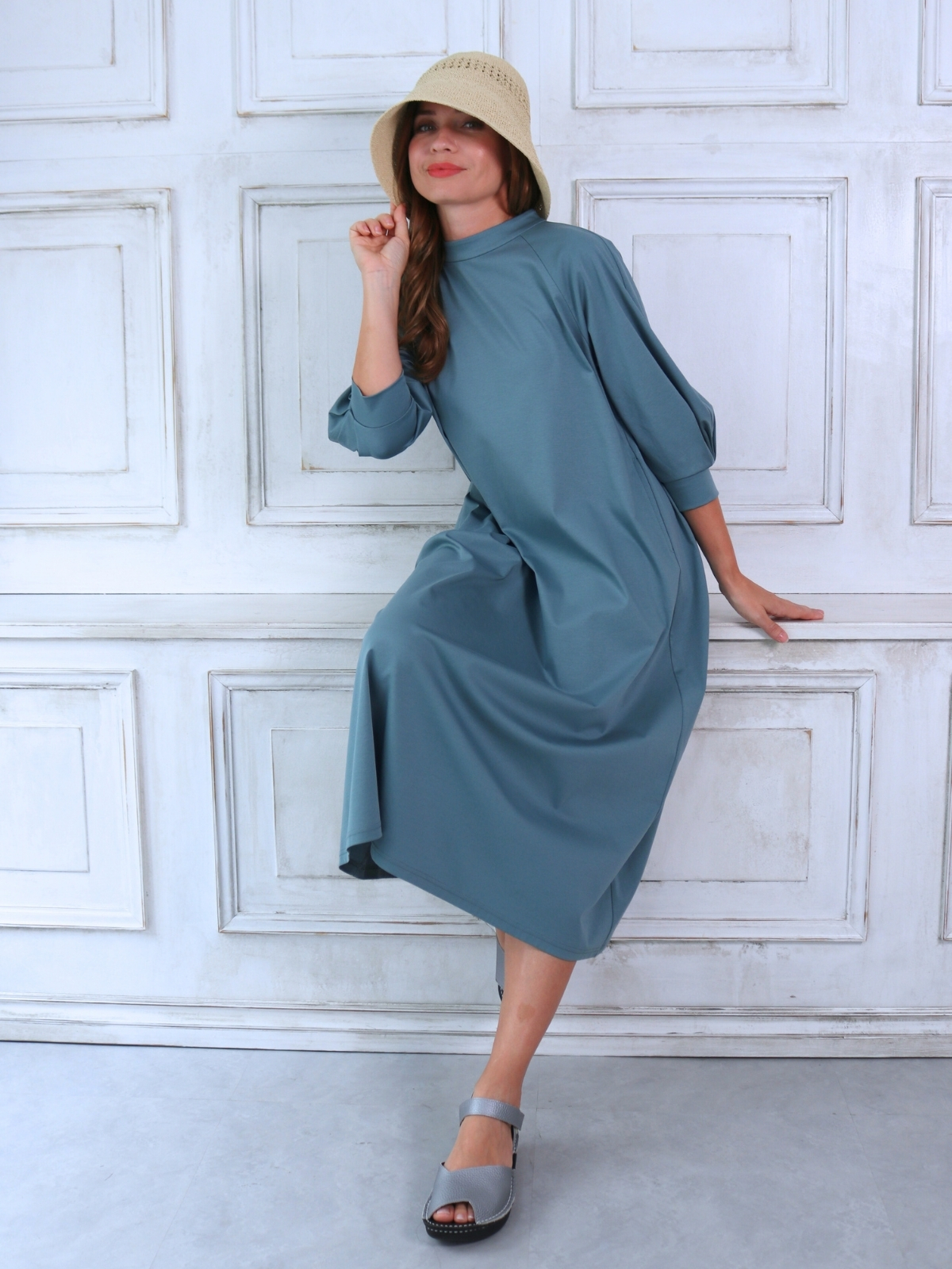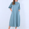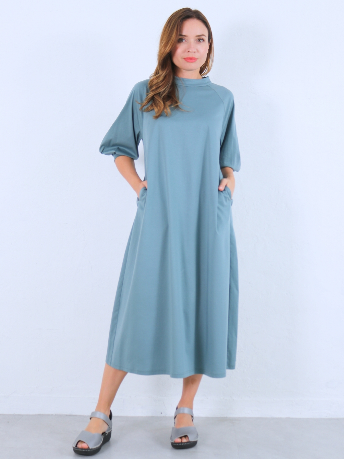 ソフトでライトなコットンスムースジャージ素材のチムニーネック・袖コンシャスワンピース。 1枚で”サマ”になる!気軽でラクチン・Aラインワンピース。
