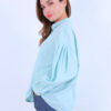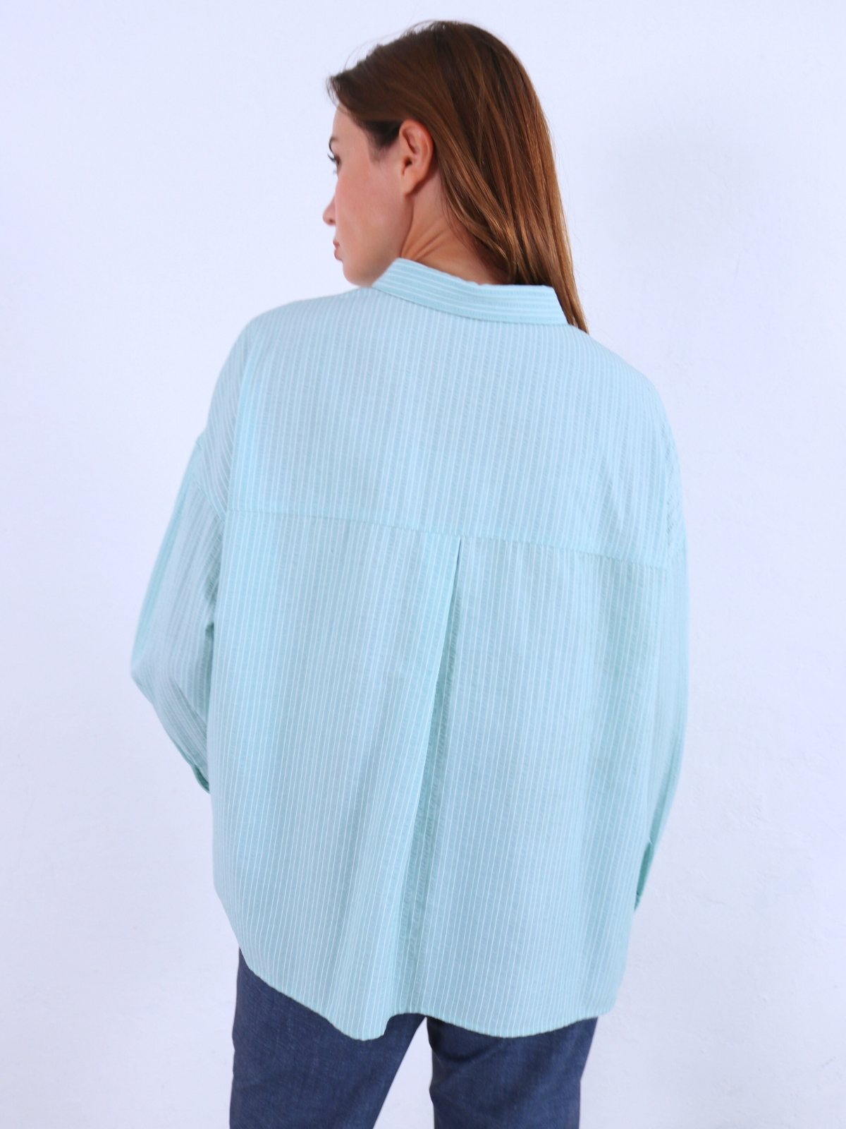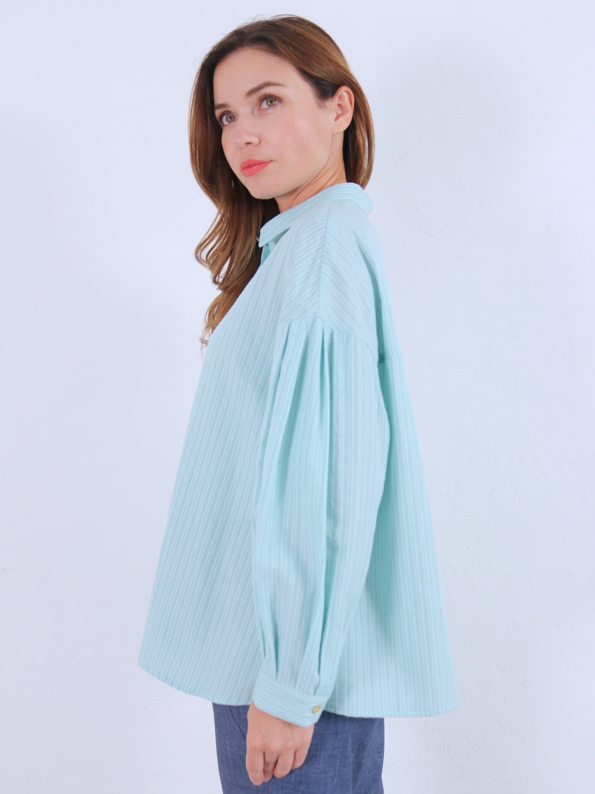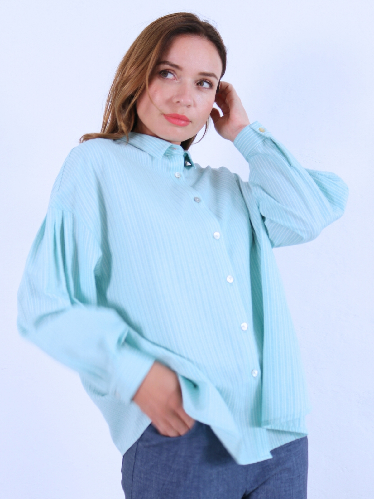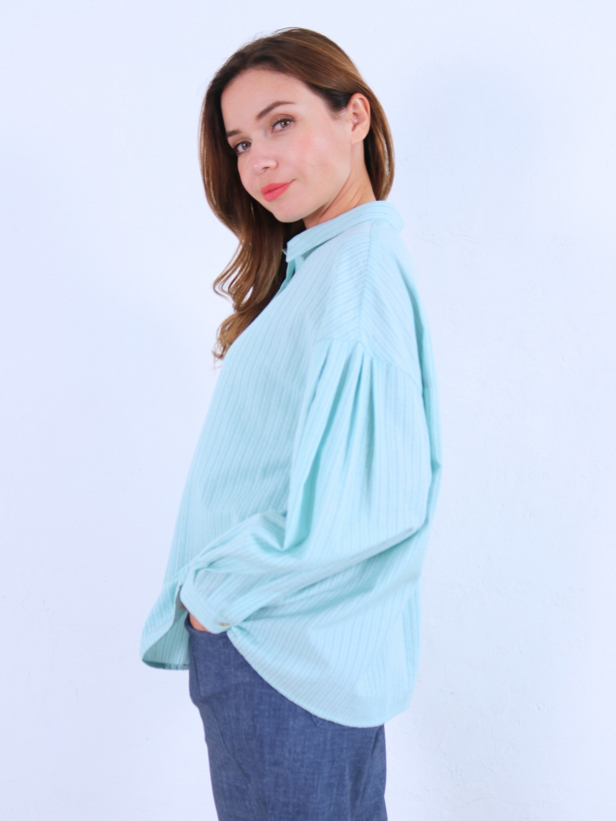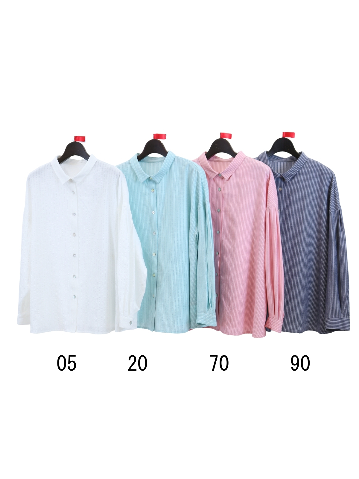 ポコポコ感が可愛いらしい素材は、肌との接触がサラッとしていて気持ち良く着て頂けるシャツブラウスです。