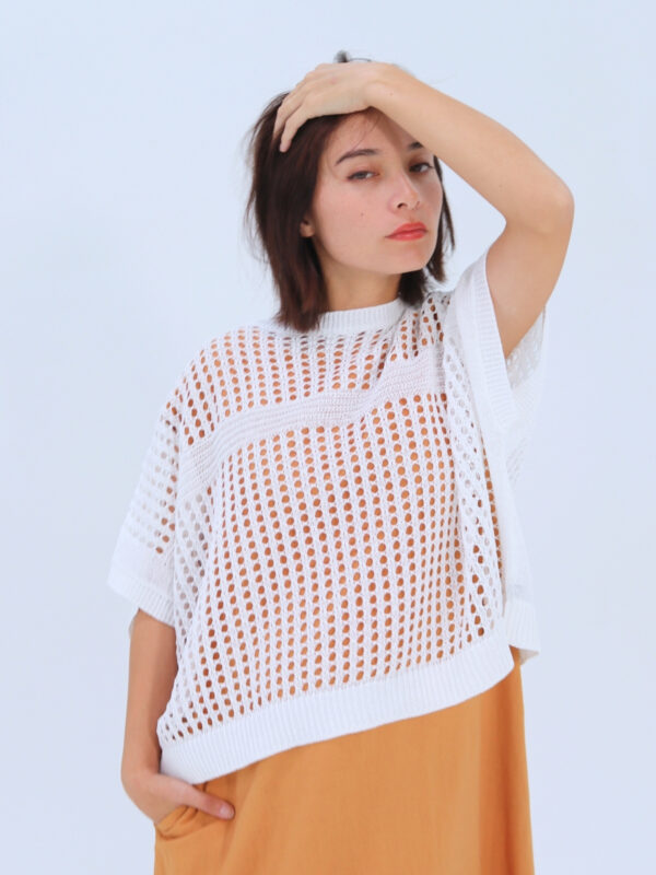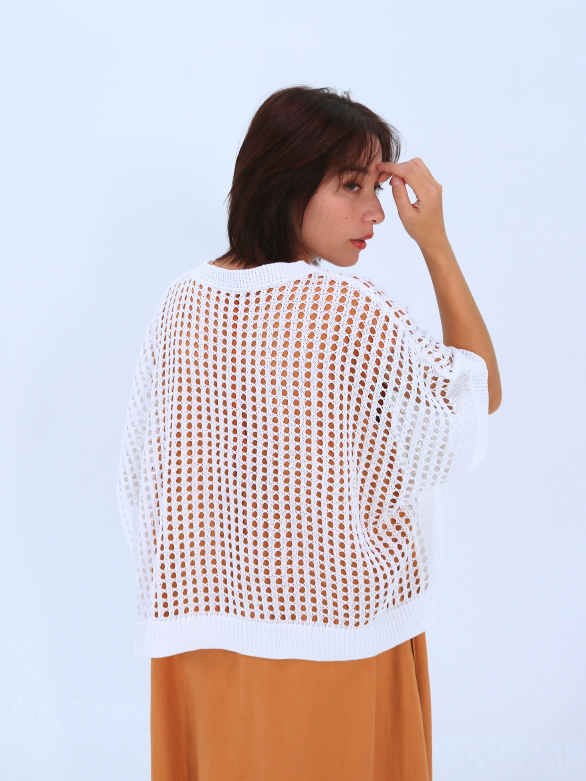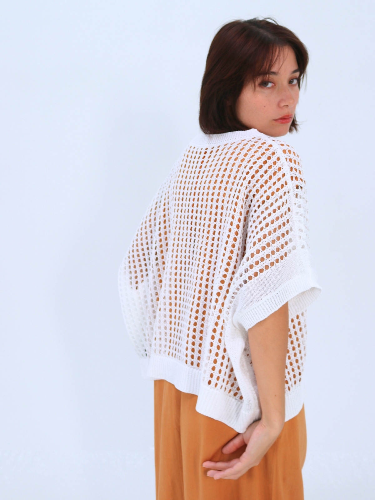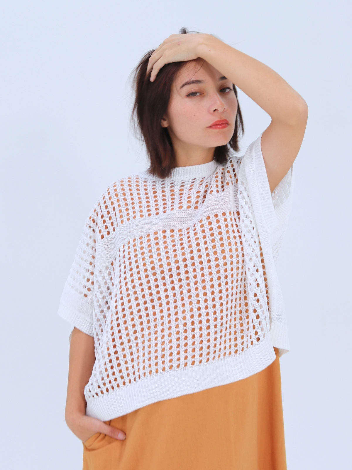 DRY感の有るポリエステル糸使用、変形メッシュ編地のゆる系重ね着ベスト。 ワンピースやスカート、パンツにも合わせられる丈感がGOOD。夏の着回しアイテム。